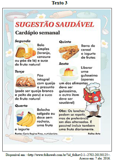 Na sugestão de lanche para a segunda, o acréscimo entre parênteses significa que