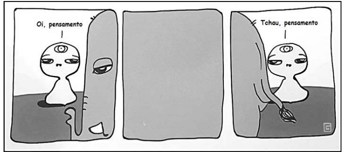 Nas falas de Guru, “Oi, pensamento” e “Tchau, pensamento”, emprega-se a vírgula pois o
