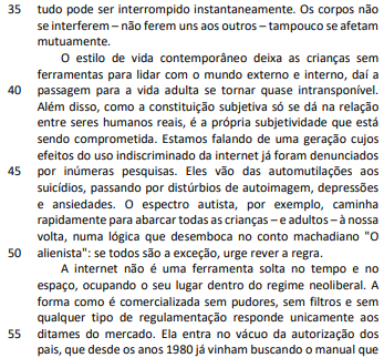 Além disso, como a constituição subjetiva só se dá na relação entre seres humanos reais, é a própria subjetividade que está sendo comprometida. (L.41-43)