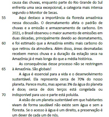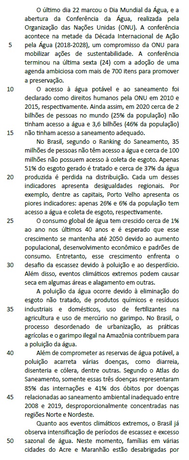 A poluição da água (1) ocorre devido à eliminação do esgoto (2) não tratado, de produtos químicos e resíduos industriais e domésticos, uso de fertilizantes na agricultura e uso de mercúrio no garimpo. (L.33-36)