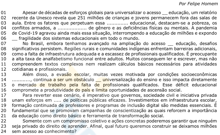 Considerando o sentido do texto, assinale a alternativa cujas palavras preenchem, correta e respectivamente, as lacunas pontilhadas nas linhas 03,04,14 e 18.