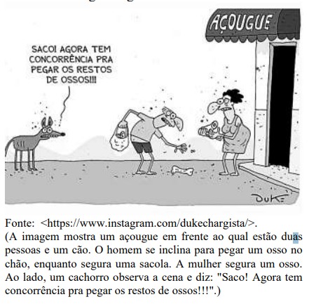 (A imagem mostra um açougue em frente ao qual estão duas pessoas e um cão. O homem se inclina para pegar um osso no chão, enquanto segura uma sacola. A mulher segura um osso. Ao lado, um cachorro observa a cena e diz: "Saco! Agora tem concorrência pra pegar os restos de ossos!!!".)
