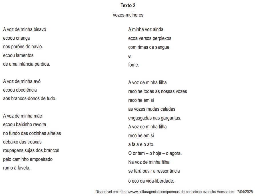 O texto 2 é um poema da escritora mineira Conceição Evaristo. Nele se reflete uma visão de mundo da autora segundo a qual