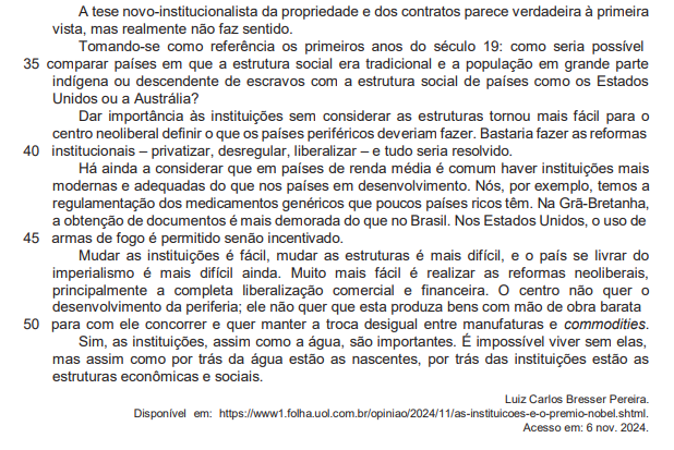 Dar importância às instituições sem considerar as estruturas tornou mais fácil para o centro neoliberal definir o que os países periféricos deveriam fazer. (L.38-39)