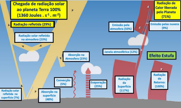 Pode-se dizer, então, que o fluxo de energia eletromagnética que chega na Terra vindo do Sol, é completamente balanceado pelo fluxo de energia eletromagnética que deixa o planeta na forma de calor. Em outras palavras, a Terra está em equilíbrio radiante, o que torna a temperatura relativamente estável ao longo de milênios. Assim, é correto afirmar que o sol fornece
