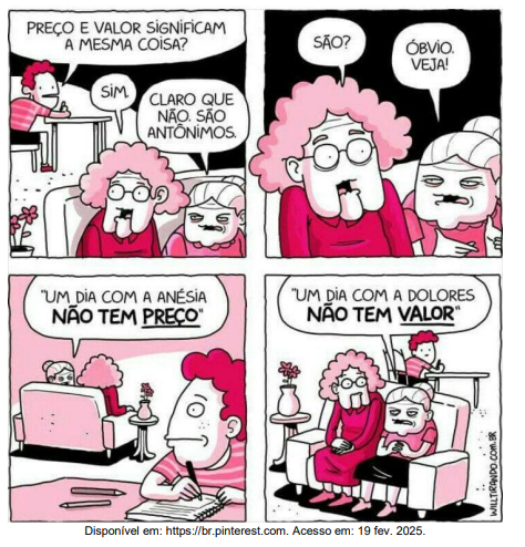 I- A pergunta do personagem, no primeiro quadro, é justificável, já que as palavras “preço” e “valor” nem sempre têm a mesma significação.