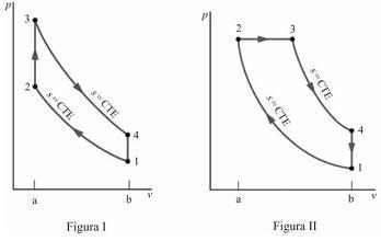 Considerando que as figuras I e II acima representem as transformações pressão (p) versus volume (v) para ciclos motores padrão a ar, julgue o item seguinte.