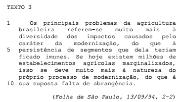 Tome como referência as seguintes frases: texto 1 - linhas 62 e 63 “- Fique aí quietinho, está ouvindo? Papai está trabalhando.” e texto 3 - linhas 1 a 6 “Os principais problemas da agricultura brasileira referem-se muito mais à diversidade dos impactos causados pelo caráter da modernização, do que à persistência de segmentos que dela teriam ficado imunes.”. É possível observar que o registro da linguagem utilizado em ambos os trechos foi diferente, podendo ser classificados, respectivamente, como registros