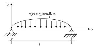 A figura representa uma viga biengastada, de seção transversal constante, solicitada a um carregamento distribuído ao longo do vão.