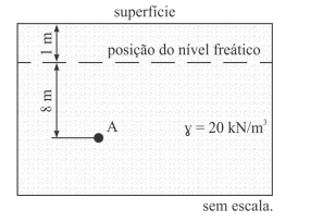 A tensão efetiva horizontal no ponto A é de 180 kN/m2, enquanto a pressão neutra é de 80 kPa.