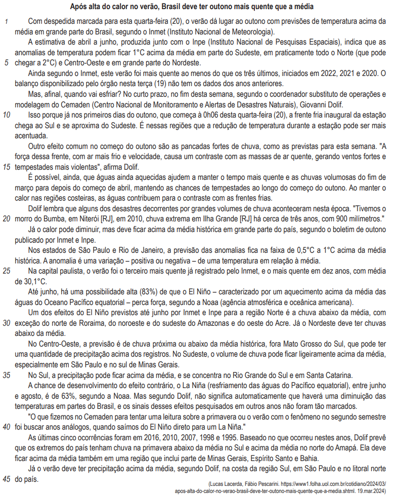 É possível, ainda, que águas ainda aquecidas ajudem a manter o tempo mais quente e as chuvas volumosas do fim de março para depois do começo de abril, mantendo as chances de tempestades ao longo do começo do outono. (L.16-17) A oração sublinhada no período acima desempenha papel de