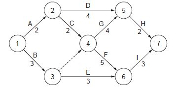 Na rede, os círculos representam os eventos e as letras representam as atividades, cuja duração, em meses, é indicada ao seu lado inferior. O tempo previsto, em meses, pelo caminho crítico é