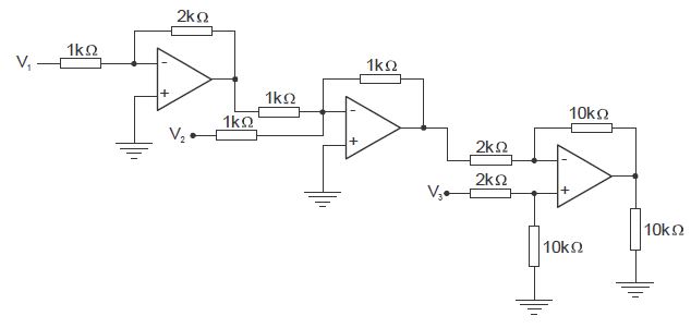 Sendo V1 = V3 = 0,5 V e V2 = -0,5 V, a tensão de saída vale: