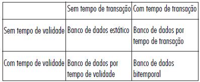 A dimensão temporal determina as representações de tempo em um banco de dados. Em relação a essa dimensão, um Sistema de Gerenciamento de Banco de Dados pode ter quatro diferentes classificações, conforme tabela a seguir.