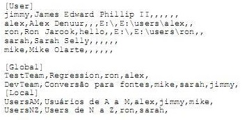 Considerando o arquivo users.txt mostrado acima, adaptado de www.microsoft.com, assinale a opção que apresenta a ação correta como resultado da execução do comando C:\>AddUsers [\\provacespe] /c c:\Users.txt /p:e.