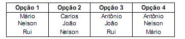 Deseja-se formar uma equipe composta por 2 advogados e um contador. De um grupo de 6 desses profissionais, em que não existe um deles que exerça ao mesmo tempo as duas profissões, propôs-se inicialmente as 4 opções de equipe abaixo.