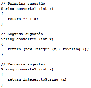 Crisóstomo, um programador Java, deseja converter um número inteiro para uma cadeia de caracteres contendo a representação decimal deste número. Pesquisando na internet, Crisóstomo depara-se com três sugestões: