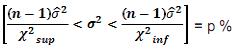 O Departamento de Recursos Humanos de uma grande empresa verificou que os salários dos funcionários da área financeira são normalmente distribuídos. Uma amostra aleatória de n salários apresentou desvio-padrão estimado igual a s. Assim, pode-se afirmar que o intervalo de p % de confiança para a variância populacional é igual a: