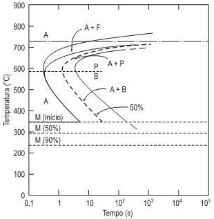 Considere o diagrama de transformação isotérmica acima para um aço com 0,45% de carbono. Para uma pequena amostra que foi austenitizada a 850°C, resfriada rapidamente (em menos de 0,4 s) até 400°C, que ficou nessa temperatura por 1.000 s e, então, sofreu têmpera em água até à temperatura ambiente, a microestrutura final (microconstituintes presentes) é, predominantemente,