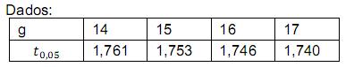As notas finais de um exame padrão de inteligência apresentam distribuição normal com desvio-padrão desconhecido. Um professor seleciona uma amostra aleatória de 16 estudantes e aplica o exame a essa amostra, obtendo uma nota média de 83 pontos e um desvio-padrão de 8 pontos. Considerando a população de tamanho infinito e t 0,05 o quantil da distribuição t de Student para teste unicaudal, tal que P ( t > t 0,05 ) com g graus de liberdade, obteve-se, com base nessa amostra, um intervalo de confiança de 90% para a média populacional.