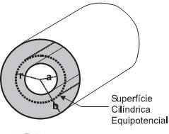 , e as superfícies condutoras dos cilindros têm espessuras desprezíveis. Considere que a superfície interna está no potencial elétrico de +50 V e a externa no potencial de 0 V.Com base nos dados fornecidos, qual a expressão do raio r de uma superfície equipotencial, cilíndrica, no interior do dielétrico, que está com potencial de +10 V?
