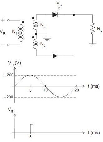 Na figura abaixo, é apresentado um retificador controlado a tiristor (SCR), alimentando uma carga resistiva RL= 20 Ω. Na mesma figura, são apresentadas as formas de onda da tensão senoidal VR no primário do transformador e do sinal VG aplicado ao gate do tiristor.