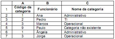 Na célula C2 foi digitada uma função que exibe um valor de acordo com o código da categoria contido na célula A2. Em seguida, essa função foi arrastada até a célula C7, gerando os valores apresentados na coluna C. A função digitada obedece aos seguintes critérios: