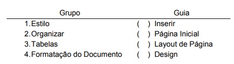 Em relação aos grupos de opções disponíveis nas guias do Microsoft Word, versão português do Office 2013, considerando a configuração de instalação padrão, correlacione as colunas a seguir: