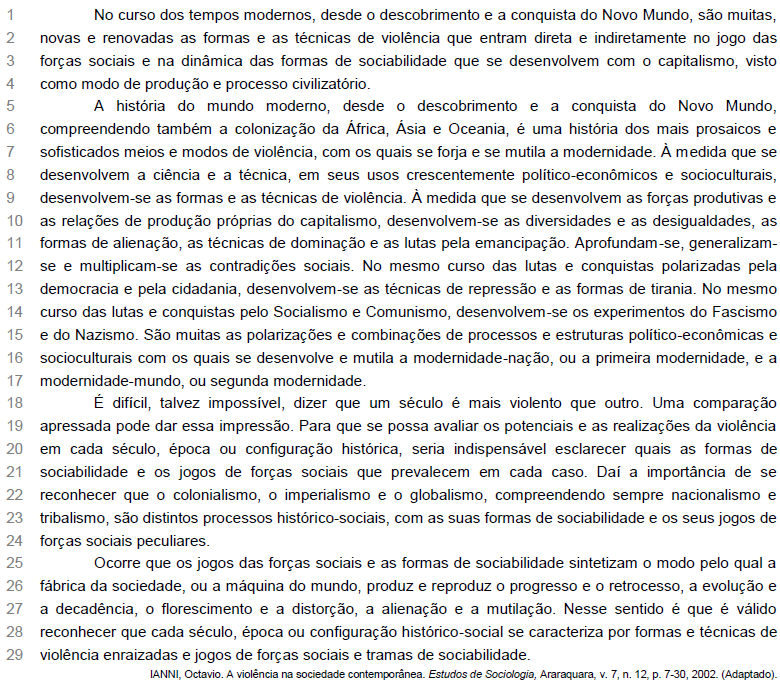No trecho “Para que se possa avaliar os potenciais e as realizações da violência” (linha 19), a expressão destacada indica uma relação semântica de