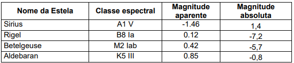 Pelos dados da tabela, é correto afirmar que, em ordem decrescente de luminosidade, as estrelas ficariam ordenadas por