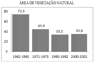 Examinando as informações do gráfico (em mil km2 ), pode-se afirmar que a diferença em km2 da área de vegetação natural remanescente no intervalo 1962- 1963 e 2000-2001 foram de: