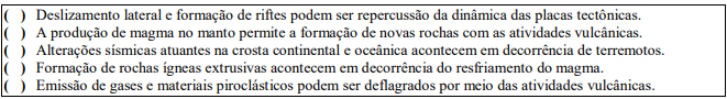 Considerando as proposições que tratam da dinâmica da litosfera e suas atividades, coloque V nas afirmativas Verdadeiras e F nas Falsas.