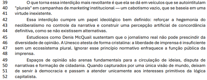 IV- “Ignorar esse princípio normativo enfraquece a função pública da imprensa.” (linhas 47 e 48) => A expressão “esse princípio” refere-se à ideia de que a liberdade de imprensa só é plena com pluralidade de vozes.
