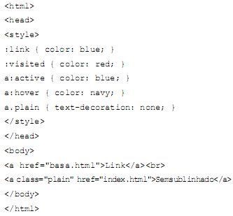 O código apresentado a seguir é adequado à criação de uma classe específica para um link específico que não contém as características gerais predefinidas, por meio de CSS, para a formatação de links de uma página HTML.
