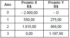 Os dois fluxos de caixa abaixo, referentes aos projetos X e Y, apresentam a mesma taxa interna de retorno positiva anual.