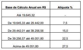 A tabela progressiva para cálculo anual do Imposto sobre a Renda da Pessoa Física para o exercício de 2013, ano-calendário 2012, é apresentada abaixo:
